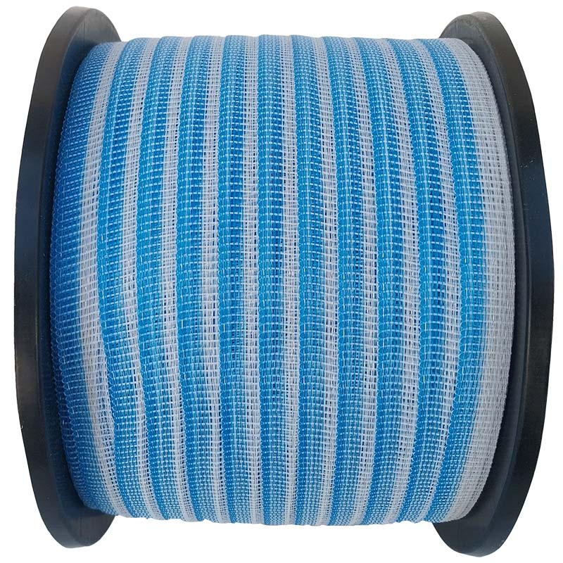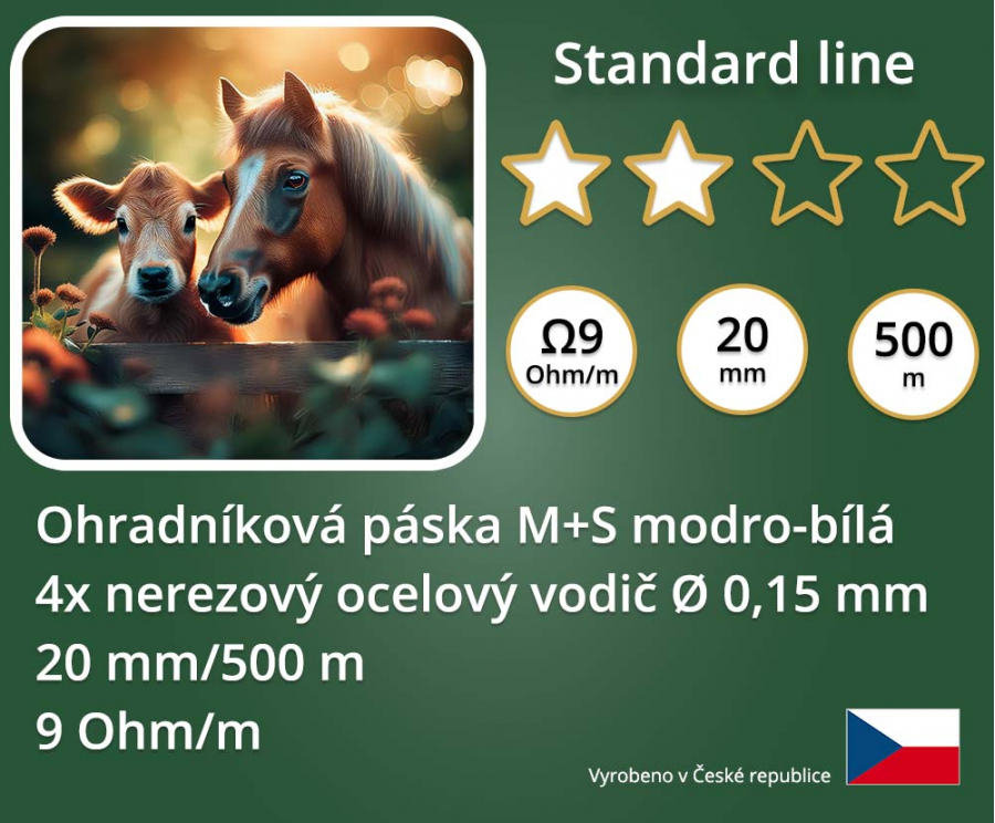 Balení 4+1 ZDARMA - Modro-bílá ohradníková páska Standard line M+S 20 mm/500 m odpor 9 Ohm/m - levná vodivá PE páska na elektrický ohradník s 4x 0,15 mm nerezovým ocelovým vodičem. Měrný odpor elektrické ohradníkové pásky 9 Ohm/m. Vodivá páska pro el. ohradník je určena pro krátké a dočasné ohrady, ale i pro ohrady střední velikost.
