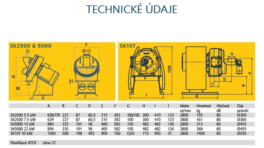 Diskové mlýny jsou dostupné ve třech velikostech: SK2500 s elektromotorem 5,5 kW a 7,5 kW SK2000 s 15kW či 22kW elektromotorem SK10T s 55kW elektromotorem. Při mletí pšenice se výkonnost pohybuje od 1 000 do 12 000 kg/h v závislosti na velikosti mlýnu a stupni semletí při běžné spotřebě pouze 5 kWh na tunu. Motor je namontovaný přímo na otočném disku, což zabezpečuje, že celý výkon motoru je využitý při mletí. Výkonnost se liší podle druhu suroviny a požadovaného stupně semletí.