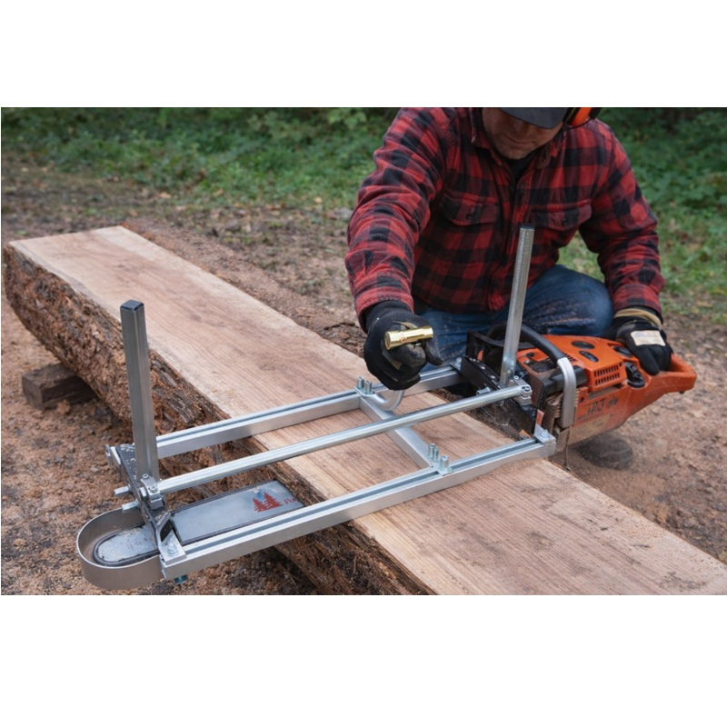 Držák motorové pily pro podélné řezání dřeva, prken a trámů o tloušťce 5-30 cm - s tímto inovativním držákem proměníte svou řetězovou pilu v efektivní přenosnou mašinu na podélné řezání kmenů přímo v terénu. Ideální řešení pro přesné podélné řezání dřeva bez nutnosti převozu k pevné pile.