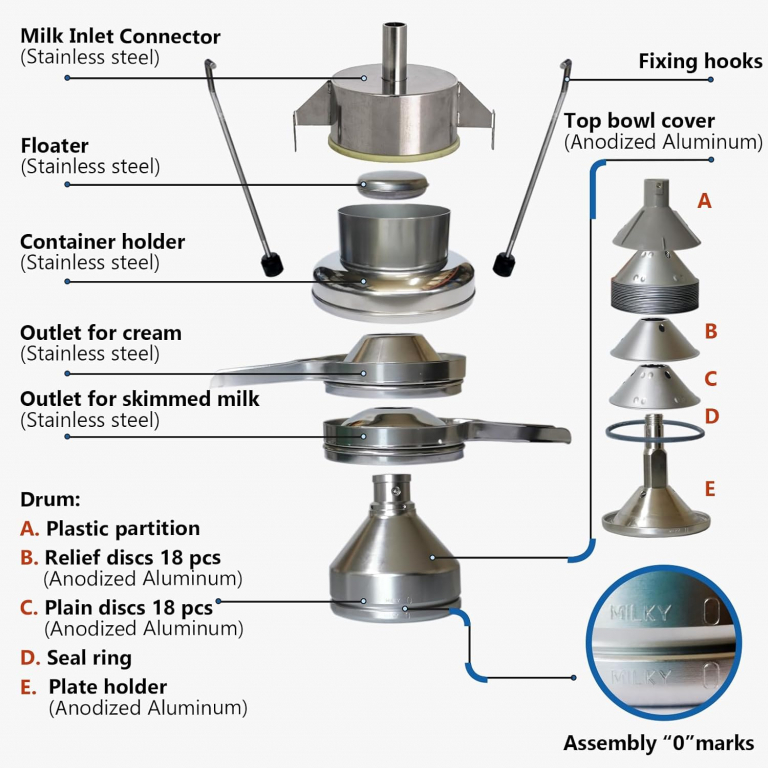 Všechny díly, které během procesu odstřeďování přicházejí do styku s mlékem jsou vyrobeny z nerezové oceli a buben je z hliníku v potravinářské kvalitě. Všechny tyto materiály prošly testy zdravotní nezávadnosti v české státní zkušebně. Použité materiály pomáhají odstraňovat všechny cizí látky jako je krev, bláto nebo plevel, které se mohou vyskytnout v mléce během separace.