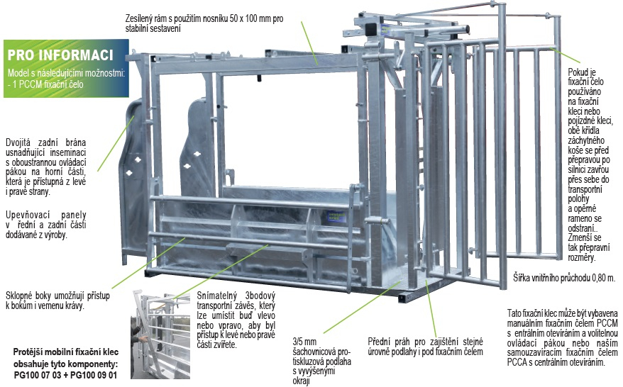 - Fixační klec má pro přepravu na komunikaci šířku 2,55 m - toho je dosaženo odstraněním tyče na nosní kroužek na fixačním čele PCCM a složením záchytného koše u modelu PCCM (pokud je klec vybavena fixačním čelem).
