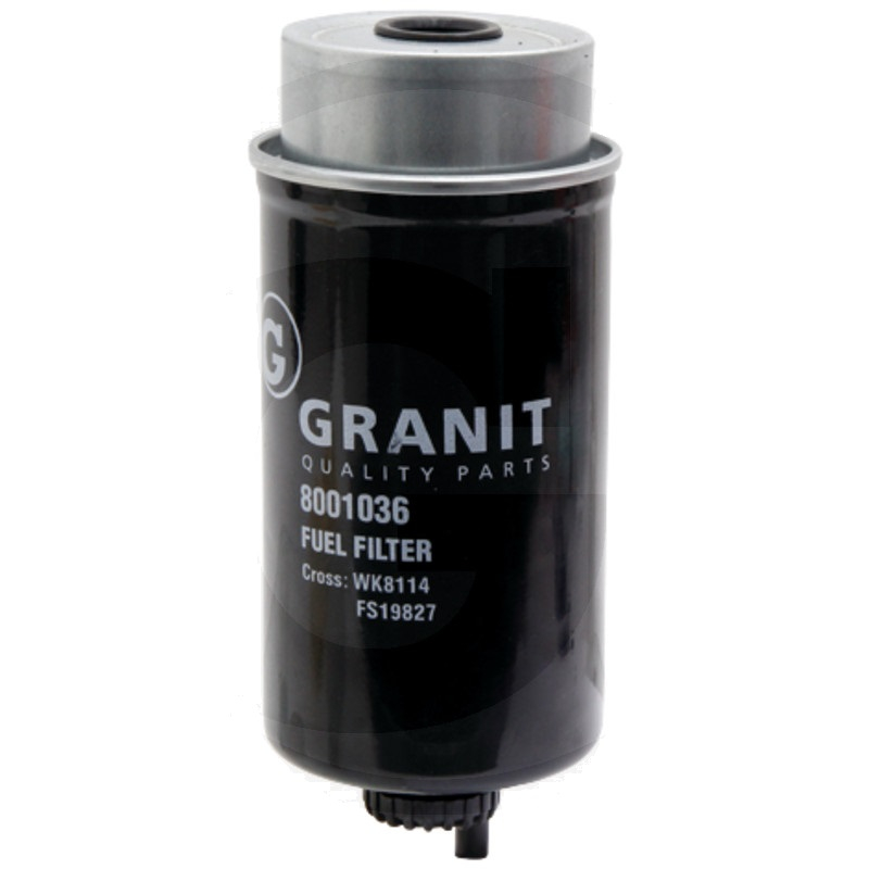 Granit 8001036 palivový filtr na Case IH, Caterpillar, Challenger, Fendt, Fiat, Ford, Hyster, John Deere, Massey Ferguson, McCormick, New Holland, Renault, Steyr, Valtra-Valmet, Yale - referenční číslo MANN WK8114, BF7677, FLEETGUARD FS19827, John Deere RE67901, Donaldson P551425, HIFI SN70133.