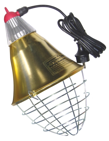 Infrazářič InterHeat s kabelem 2,5 m pro kuřata a selata - infralampa na infražárovky vhodná pro odchov selat a drůbeže, Součástí infrazářiče je 2 m závěsný řetízek a kabel pro připojení do elektrické sítě. Vyhřívací infra lampa je vybavena chladičem objímky, který chrání infra žárovku před přehřátím a tím prodlužuje životnost infražárovky, ochranný drátěný kryt má tvar koše, je z hliníku průměr 21 cm.