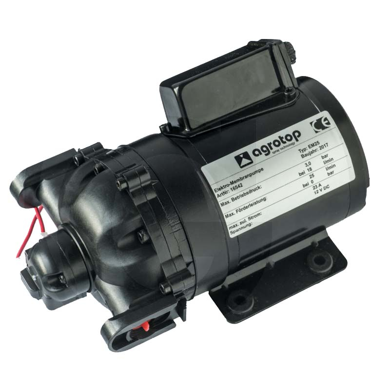 Membránové čerpadlo pro postřikovače Agrotop EM 25 - membránové čerpadlo Agrotop EM 25 je osazeno třemi membránami z materiálu EPDM a pohání jej 12V stejnosměrný motor. Díky svým kompaktním rozměrům a odolné konstrukci je vhodné zejména pro použití v menších přenosných postřikovačích nebo při aplikacích v úzkých a hůře přístupných prostorech. Čerpadlo je vybaveno tlakovým spínačem, který při dosažení přetlaku automaticky přeruší jeho provoz.