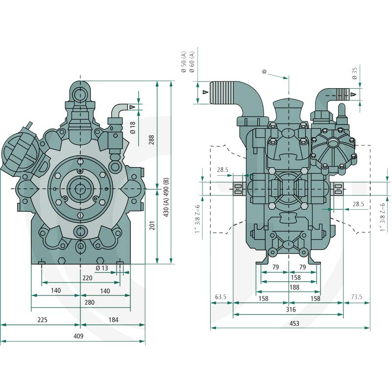 Pístomembránové čerpadlo pro postřikovače Annovi Reverberi AR250 BP C/C BlueFlex - pístové membránové čerpadlo navržené pro použití v zemědělských postřikovačích a aplikacích nízkotlakého postřiku. Tento model je vybaven průchozí vývodovou hřídelí (M 1 3/8″ s 6 zuby), což umožňuje jeho mechanické spojení s vývodovou hřídelí traktoru nebo jiným pohonem. Čerpadlo pracuje při otáčkách 550 obr./min, nabízí maximální průtok přibližně 254 l/min a pracovní tlak až 20 bar (odpovídající cca 290 psi), což je vhodné pro běžné postřikové úlohy ve středně velkých aplikacích.