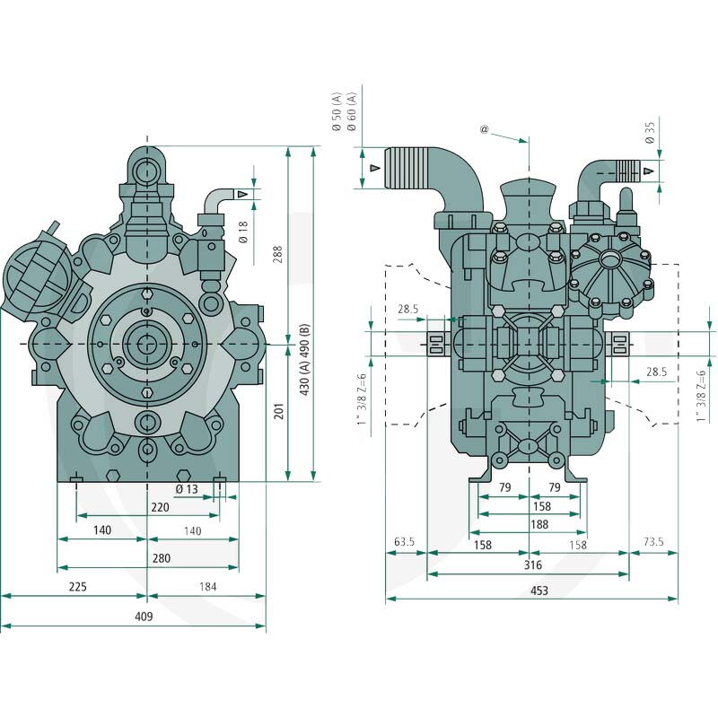 Pístomembránové čerpadlo pro postřikovače Annovi Reverberi AR280 BP C/C BlueFlex - výkonné pístomembránové čerpadlo určené pro použití v zemědělských postřikovačích a aplikacích nízkotlakého postřiku. Čerpadlo je osazeno šesti semi-hydraulickými membránami z materiálu BlueFlex, který nabízí vyšší odolnost vůči opotřebení a chemickému působení postřikových kapalin. Díly, které přichází do styku s čerpanou kapalinou, jsou z plastem upraveného hliníku a nerezové oceli, což zvyšuje odolnost vůči korozi. Model C/C je vybaven průchozí hřídelí (oboustranná kardanová hřídel 1 3/8″ s 6 drážkami), umožňující přímé napojení na vývodovou hřídel traktoru nebo jiný pohon.