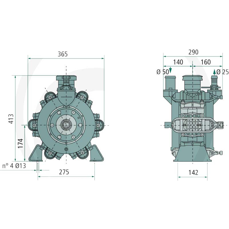 Čerpadlo má vstupní sací přípojku o průměru 50 mm a výtlačnou přípojku 25 mm, což odpovídá běžným standardům v agrárním nasazení. Jeho robustní, ale zároveň relativně kompaktní konstrukce zajišťuje stabilní a dlouhodobý provoz při různých polních podmínkách. Díky použitým materiálům a osvědčenému membránovému systému poskytuje spolehlivý výkon i při častém používání bez nutnosti složité údržby.