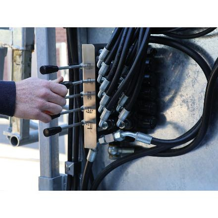 Plně hydraulické ovládání – přední dveře, zadní fixace, břišní pás, přední i zadní nohy