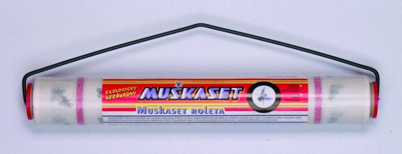 Stájová mucholapka MUŠKASET role 5 m x 30 cm - lepový prostředek určený pro redukci populace obtížného létavého hmyzu. Je účinný zvláště na mouchu domácí. Lepový pás o rozměrech 30 x 500 cm. Podle množství hmyzu a velikosti ošetřované plochy se ze svitku odmotá potřebná délka pásu. Hmyz je lákán grafickými symboly na lepové ploše.