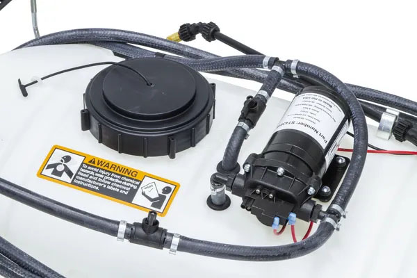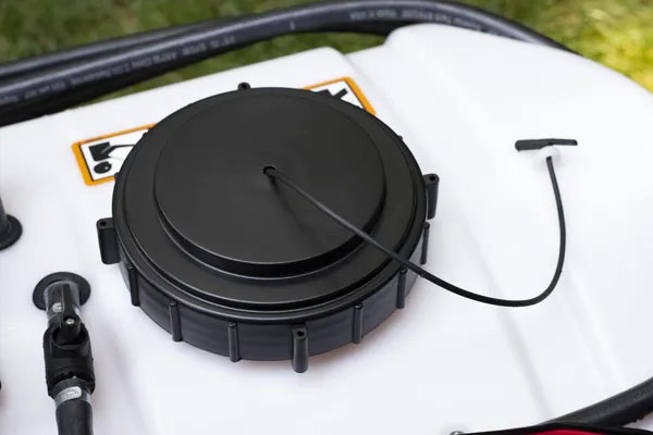 - Kompletní postřikovač s nádrží o objemu 56 litrů (15 galonů), hladina náplně je čitelná na vnější straně nádrže.