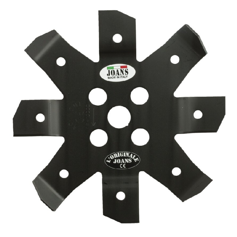 Žací nůž na křovinořez 8 zubů šířka řezu 255 mm otvor 25 mm tloušťka 3 mm na trávu JOANS - řezné hrany z robustní speciální oceli jsou odolné proti opotřebení a umožňují posečení jemné čerstvé vegetace.